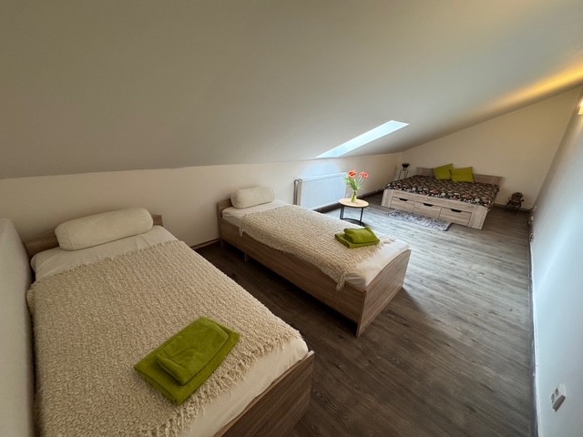Druhá podkrovní ložnice nabízí komfortní ubytování až pro pět osob.