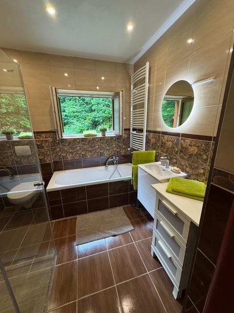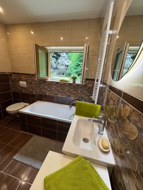Koupelna s vanou i sprchovým koutem nabízí maximální komfort a soukromí. Interiér je laděn do teplých přírodních tónů. Dominantou je velké okno s výhledem do zeleně a na penzion Stará plynárna.