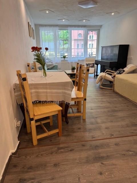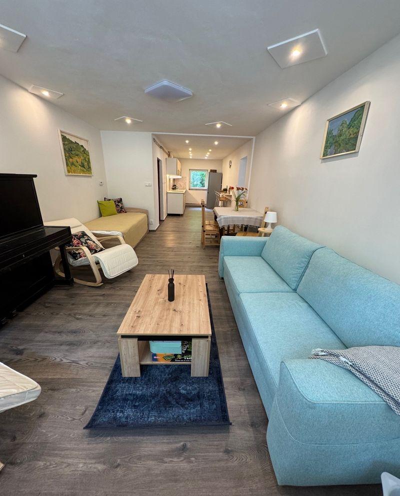 Dominantou Apartmánu je prostorný obývací pokoj s pohodlnou rozkládací sedačkou a jednou samostatnou postelí. Atmosféru dotváří houpací křesla a klavír, který potěší všechny hudebně založené hosty. Díky velkým francouzským oknům je místnost krásně prosvětlená, z balkonu se nabízí výhled na obec Hřensko a řeku Kamenici.